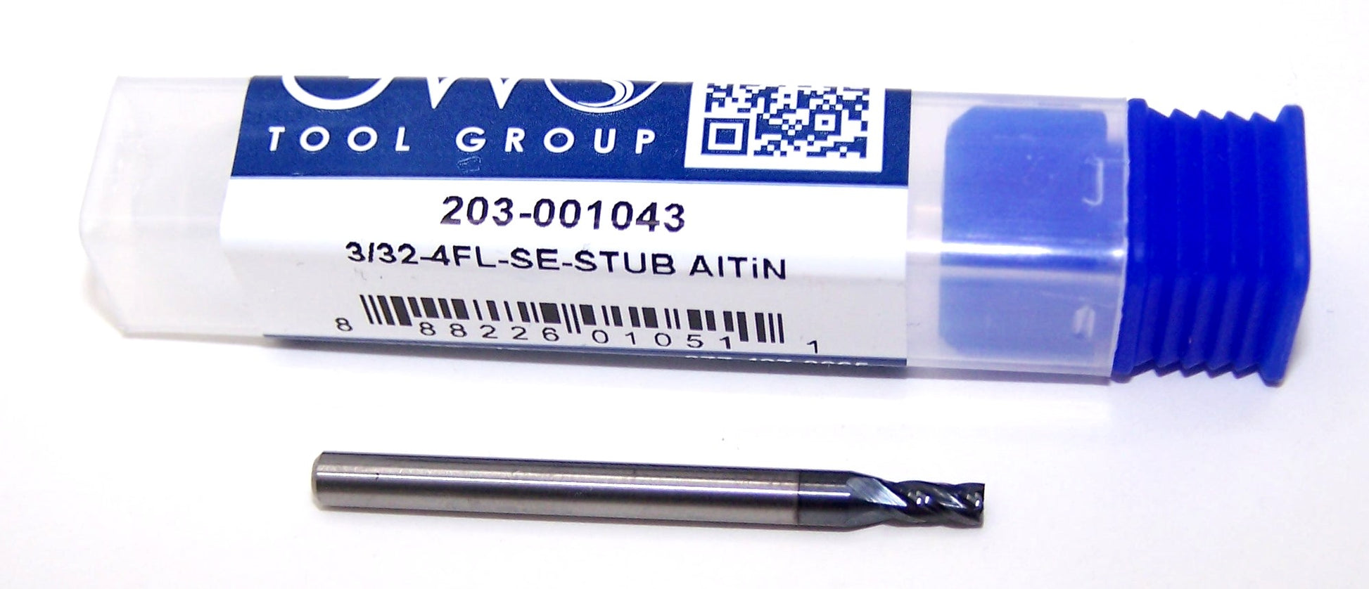 203-001043 Monster Tool 3/32" Carbide 4 Flute End Mill Stub Length AlTiN Coated .0938" Diameter 0.1875" Flute 1.5" Length 0.125" Shank GWS Tool Group