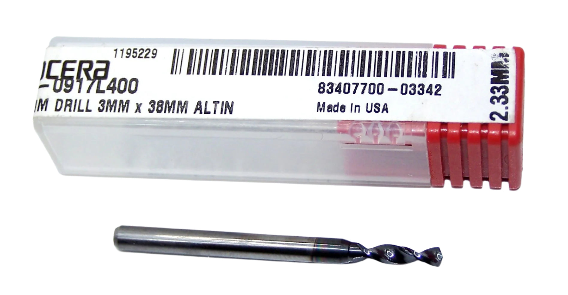 226-0917L400 Kyocera 2.33mm Carbide Drill 2 Flute ALTiN Coated 0.0917" Diameter 0.400" Flute 1.5" Length 0.1181" Shank 130° Point