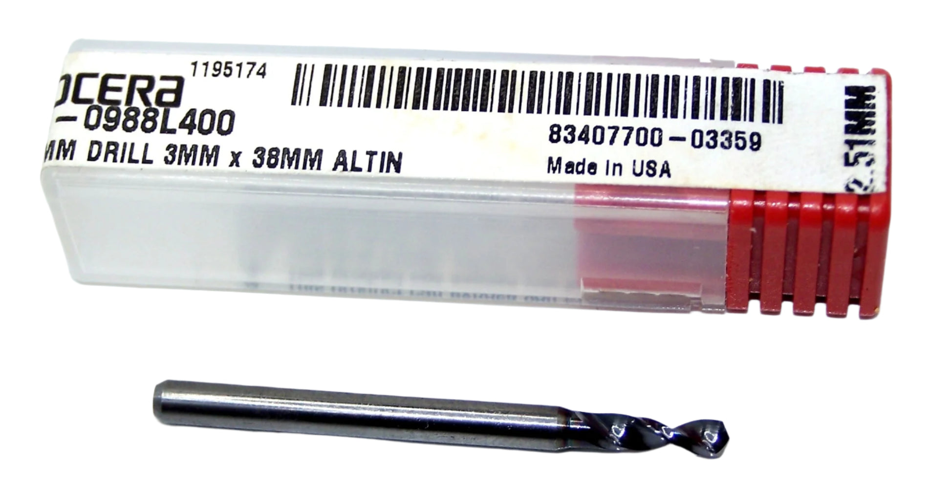 226-0988L400 Kyocera 2.51mm Carbide Drill 2 FLUTE ALTiN Coated 0.0988" Diameter 0.400" Flute 1.5" Length 0.1181" Shank 130° Point
