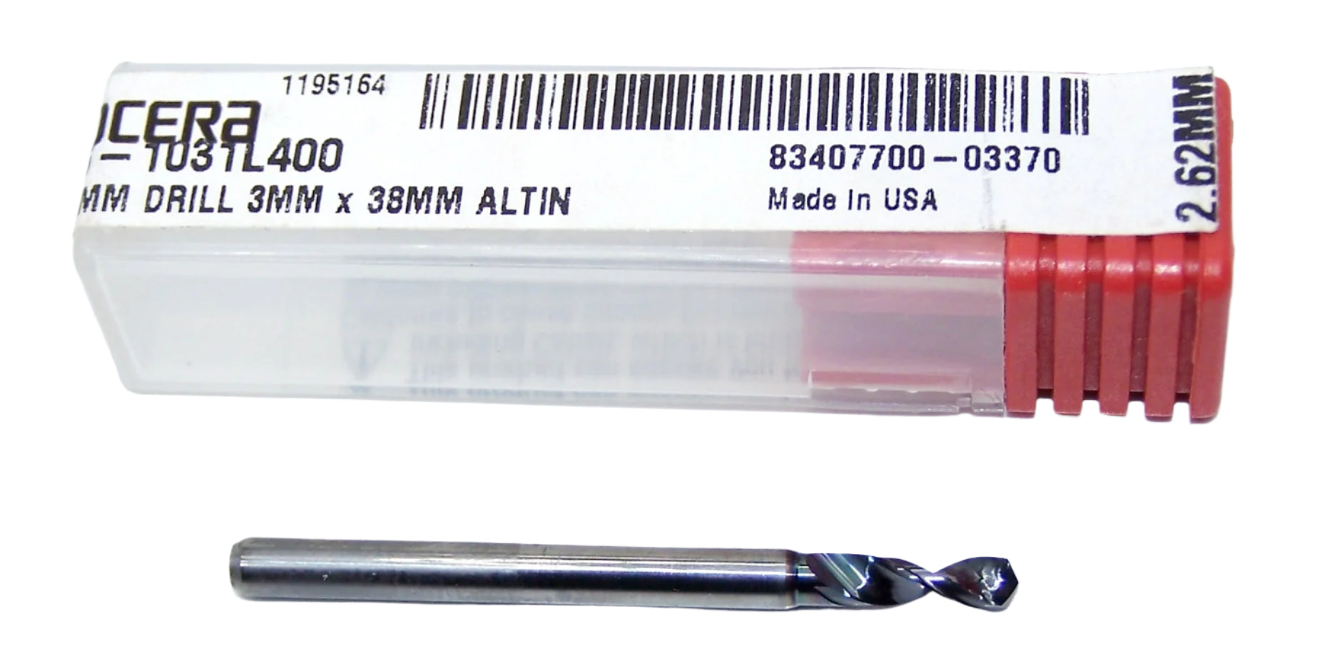 226-1031L400 Kyocera 2.62mm Carbide 2 Flute Drill PCB Type ALTiN Coated 0.1031" Diameter 0.400" Flute 1.5" Length 0.1181" Shank 130° Point