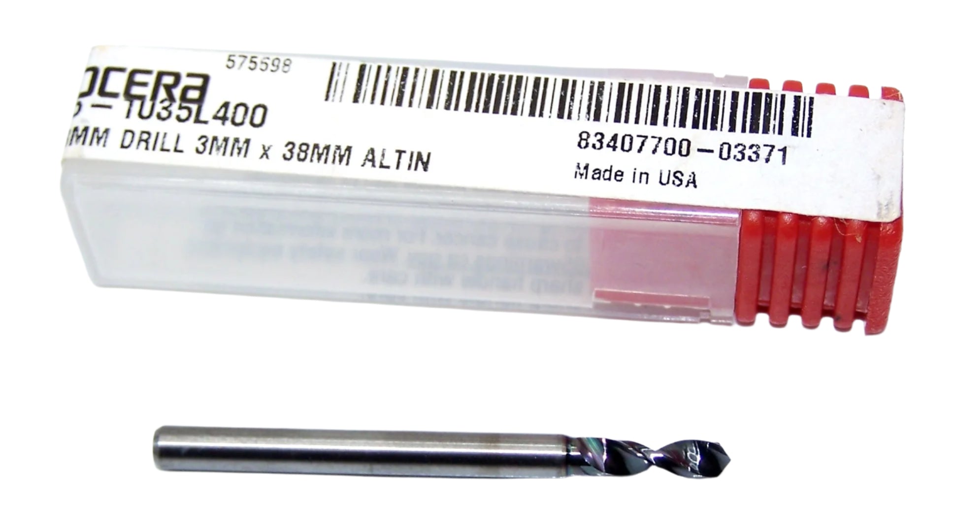 226-1035L400 Kyocera 2.63mm Carbide 2 Flute Drill ALTiN Coated 0.1035" Diameter 0.400" Flute 1.5" Length 0.1181" Shank 130° Point