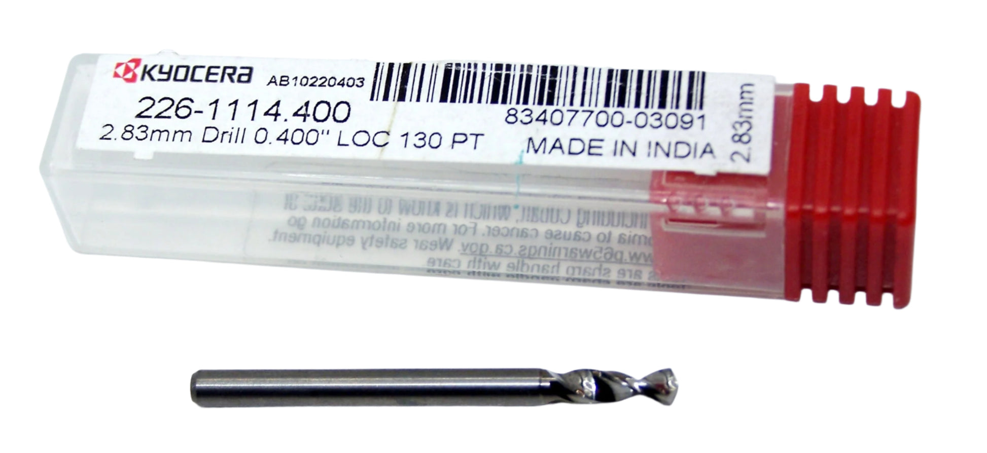 226-1114.400 Kyocera 2.83mm Carbide Drill 2 FLUTE 0.1114" Diameter 0.400" Flute 1.5" Length 0.1181" Shank 130° Point