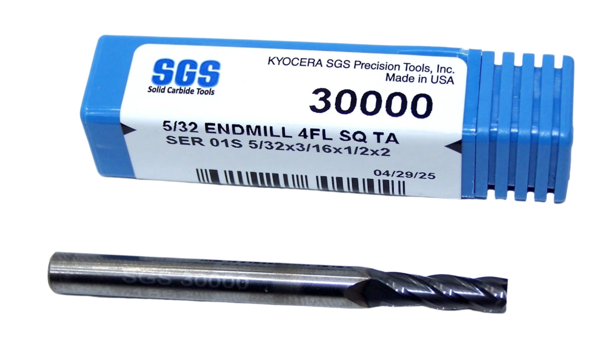 30000 Kyocera SGS 5/32" Carbide 4 Flute End Mill Square AlTiN Coated .1562" Diameter .625" Flute 2.00" Length .188" Shank General Purpose