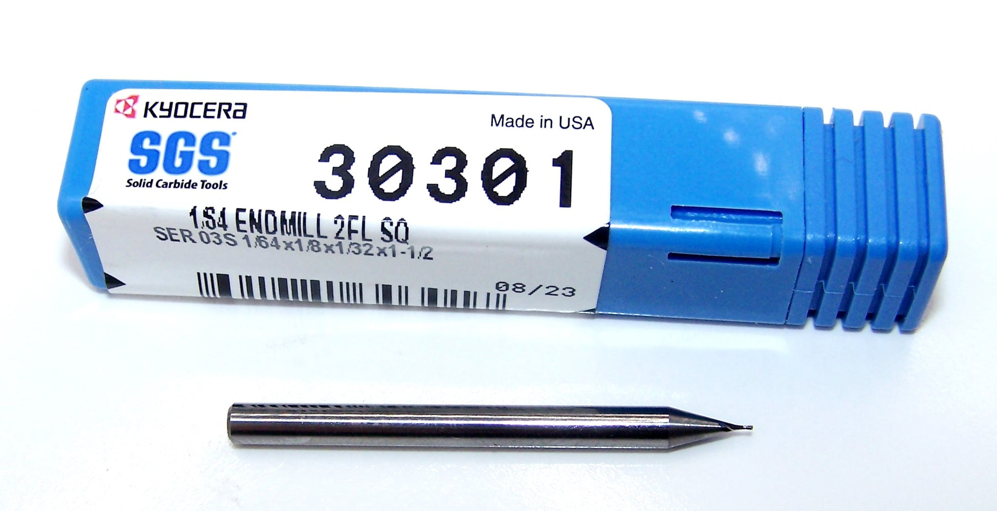 30301 Kyocera SGS 1/64" Carbide End Mill 2 Flute SQ .0156" DIA .031" Flute 1.50 Length .125" Shank