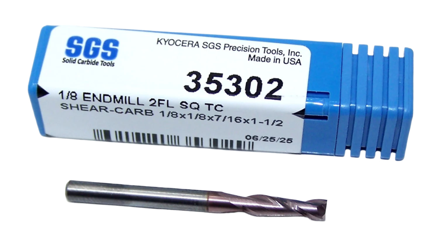 35302 Kyocera SGS 1/8" Carbide 2 Flute End Mill SHEAR-CARB TiCN Coated .125" Diameter 0.437"Flute 1.50" OAL .125" Shank