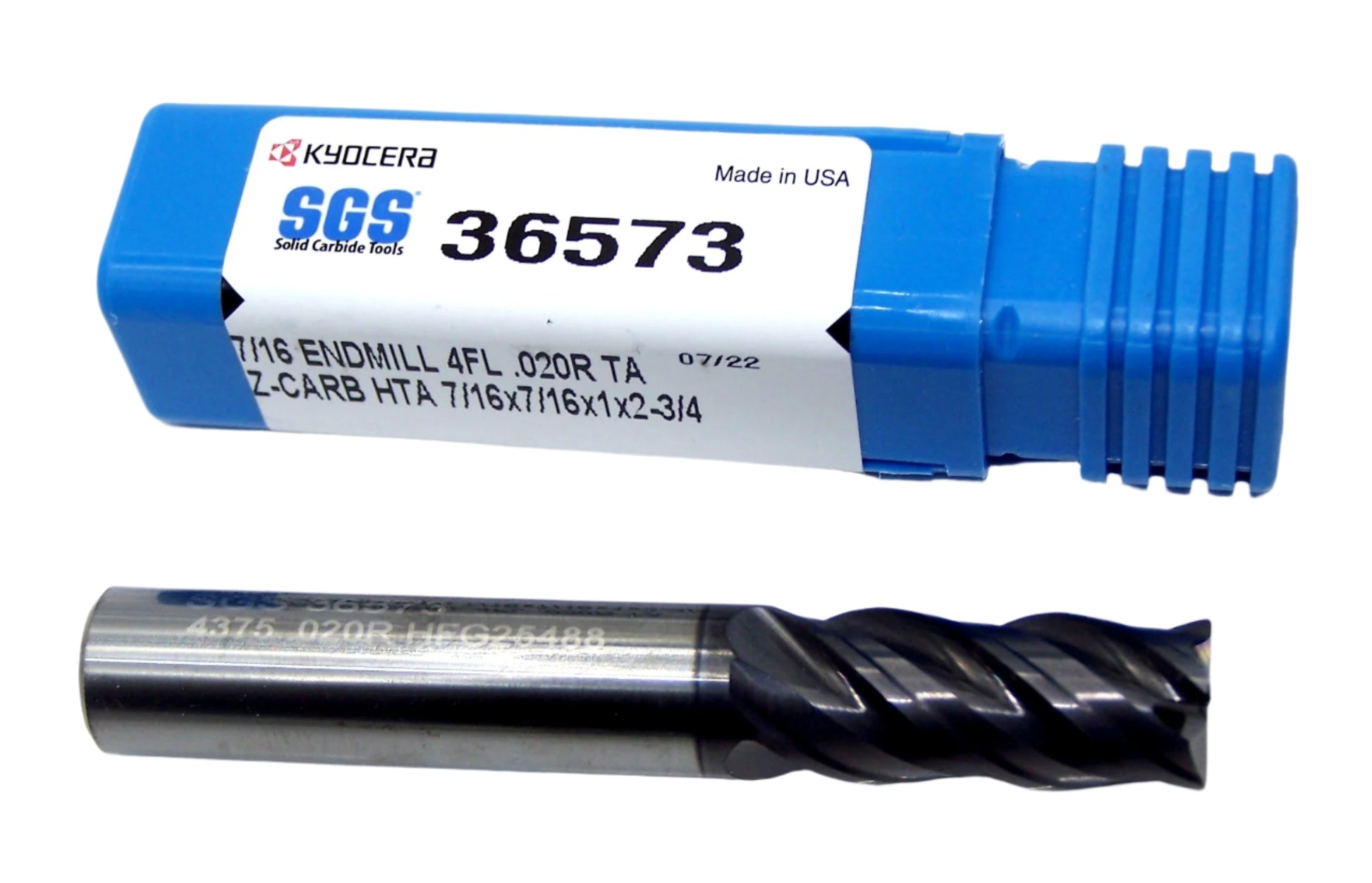 36573 Kyocera SGS 7/16" Carbide 4 Flute End Mill .020" Radius .4375" Diameter 1.00" Flute 2.75" Length .4375" Shank Z-Carb HTA