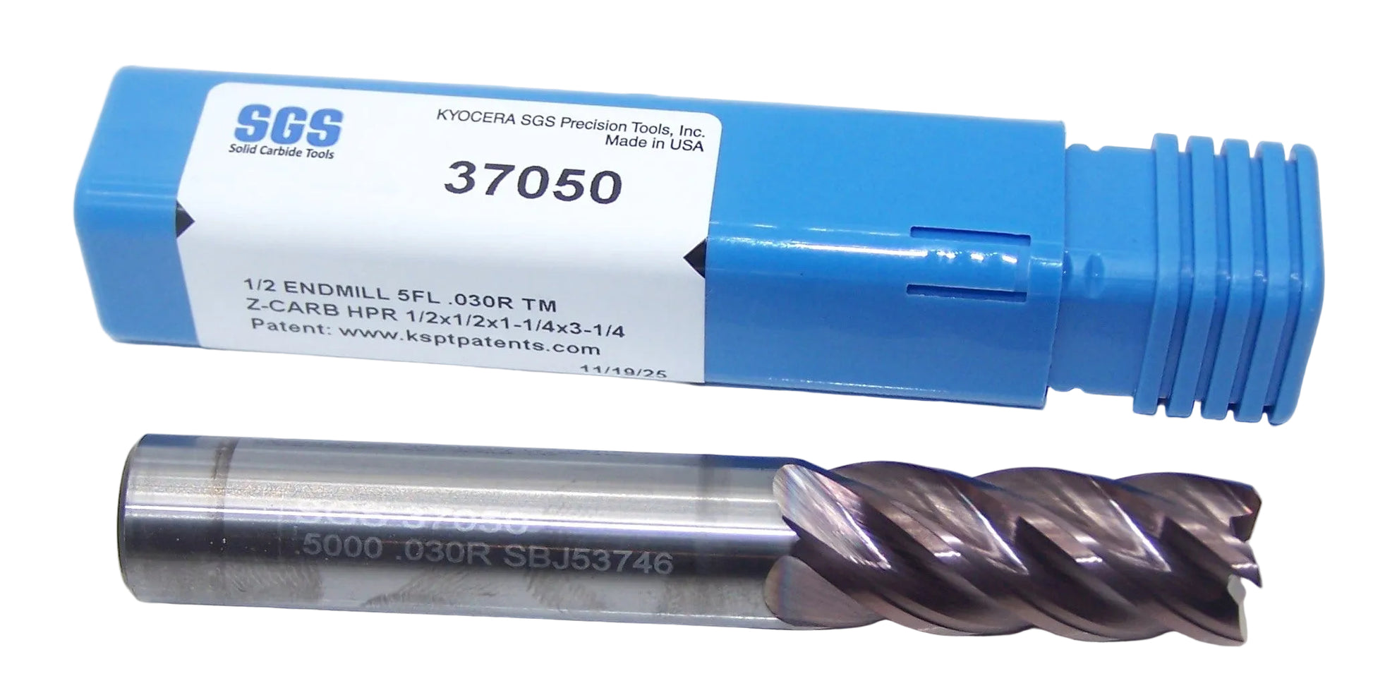 37050 Kyocera SGS 1/2" Carbide 5 Flute End Mill .030" Radius .500" Diameter 1.25" Flute 3.25" Length .500" Shank Z-Carb HPR