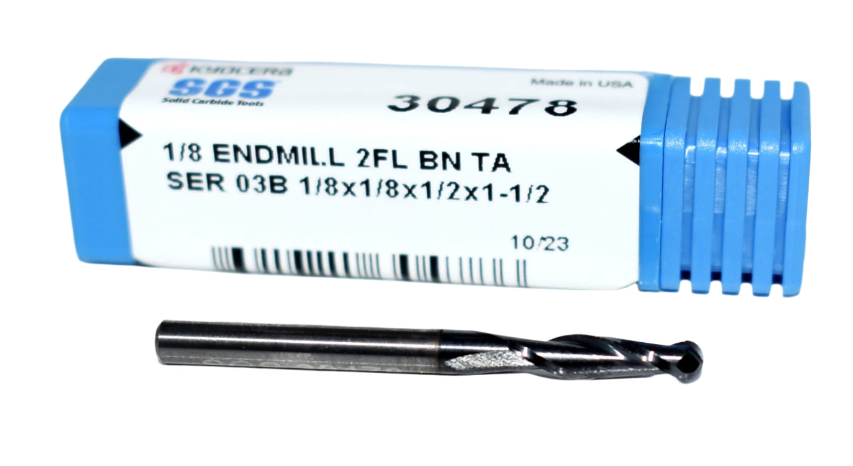 30478 Kyocera SGS 1/8" Carbide 2 Flute End Mill Ball End AlTiN .125" Diameter .500" Flute 1.50" Length .125" Shank