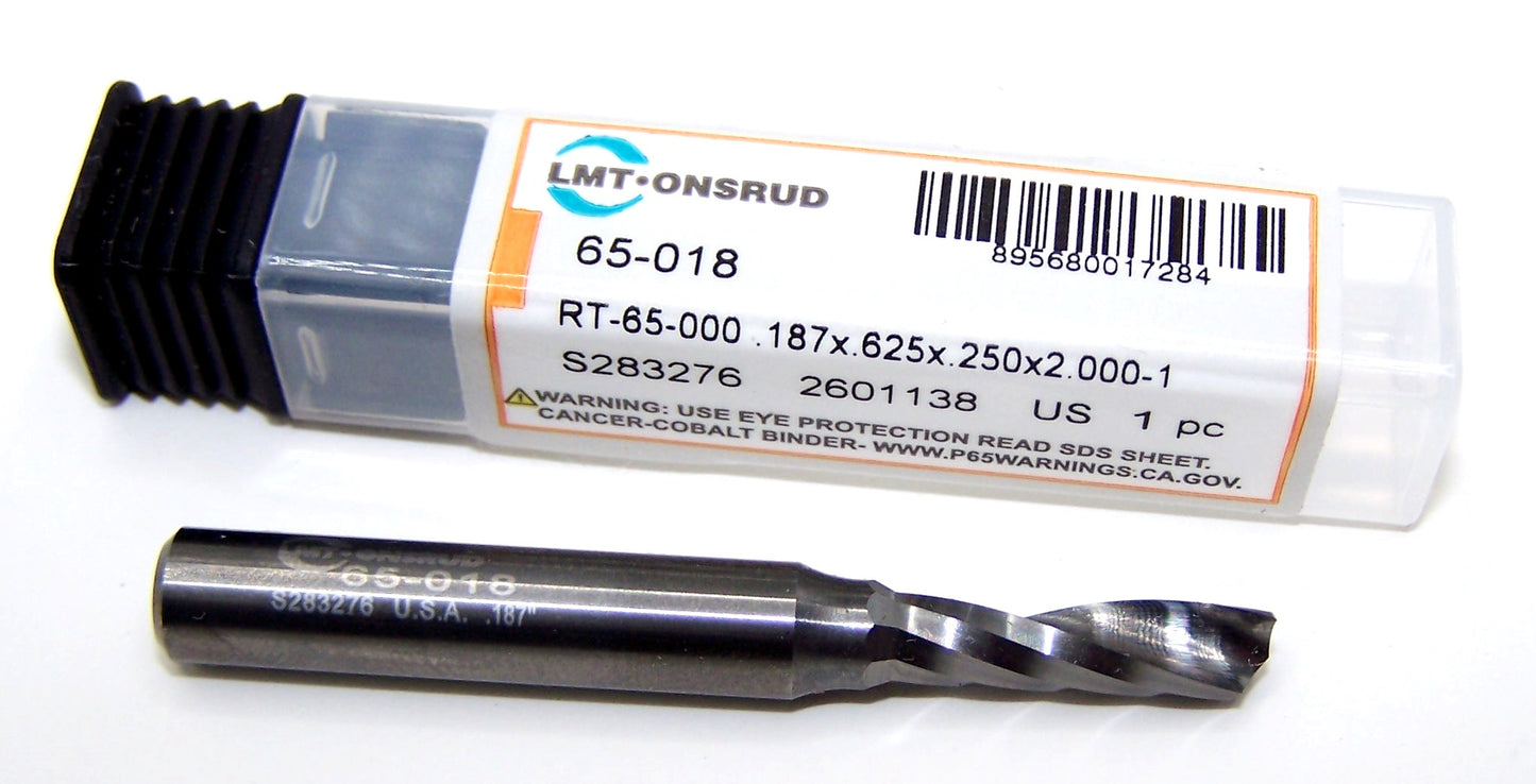65-018 Onsrud 3/16" Carbide Single "O" Flute Router .1875" Diameter .625"Flute 2.00 Length .250" Shank for Plastic, Wood, Aluminum