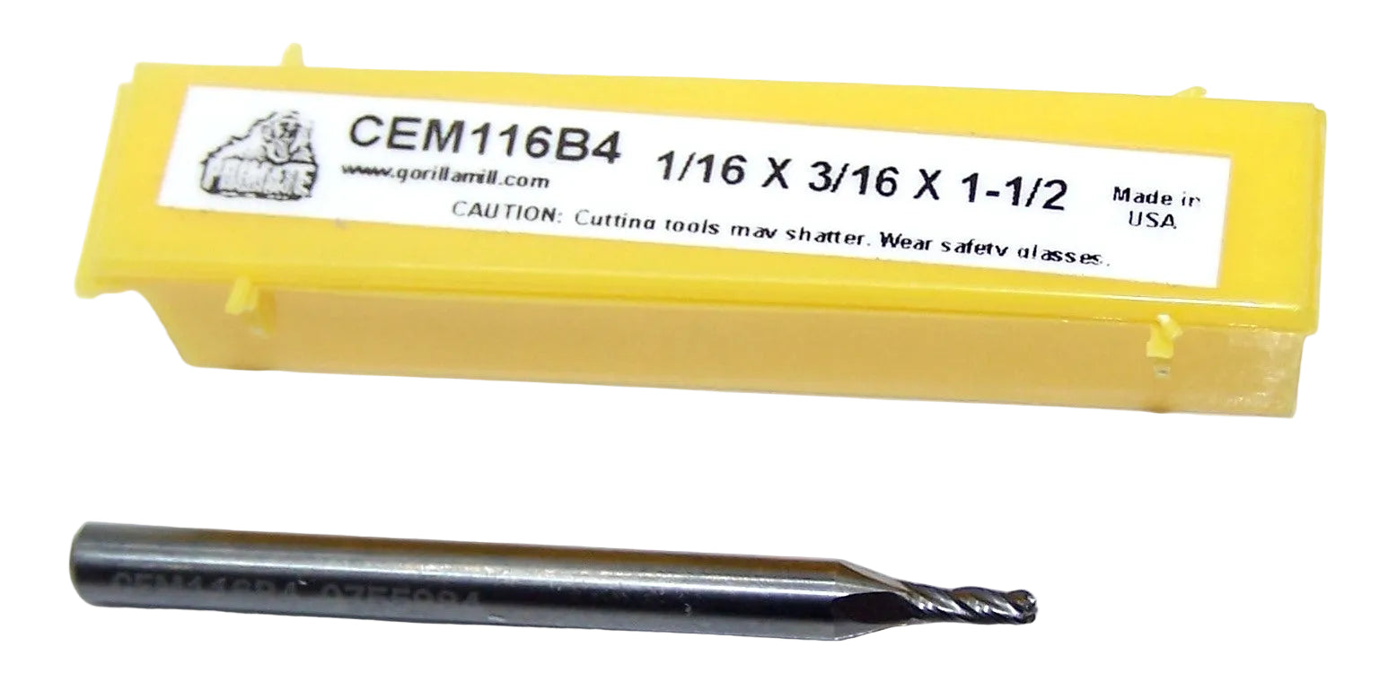 70315 Gorilla Mill 1/16" Carbide 4 Flute End Mill Ball End .1250" Diameter .1875" Flute 1.50" Length .125" Shank PRIMATE