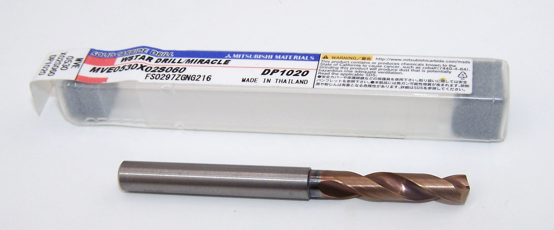 MVE0530X02S060 Mitsubishi Carbide 5.30mm Carbide Drill 2 Flute External Coolant .2087" Diameter 1.063" Flute 2.638" Length .236" Shank 140° Point