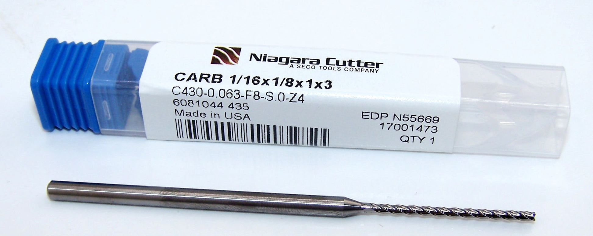 N55669 Niagara 1/16" Carbide 4 Flute End Mill Extended Length 0.0630" Diameter 1.00" Flute 3.00" Length .125" Shank