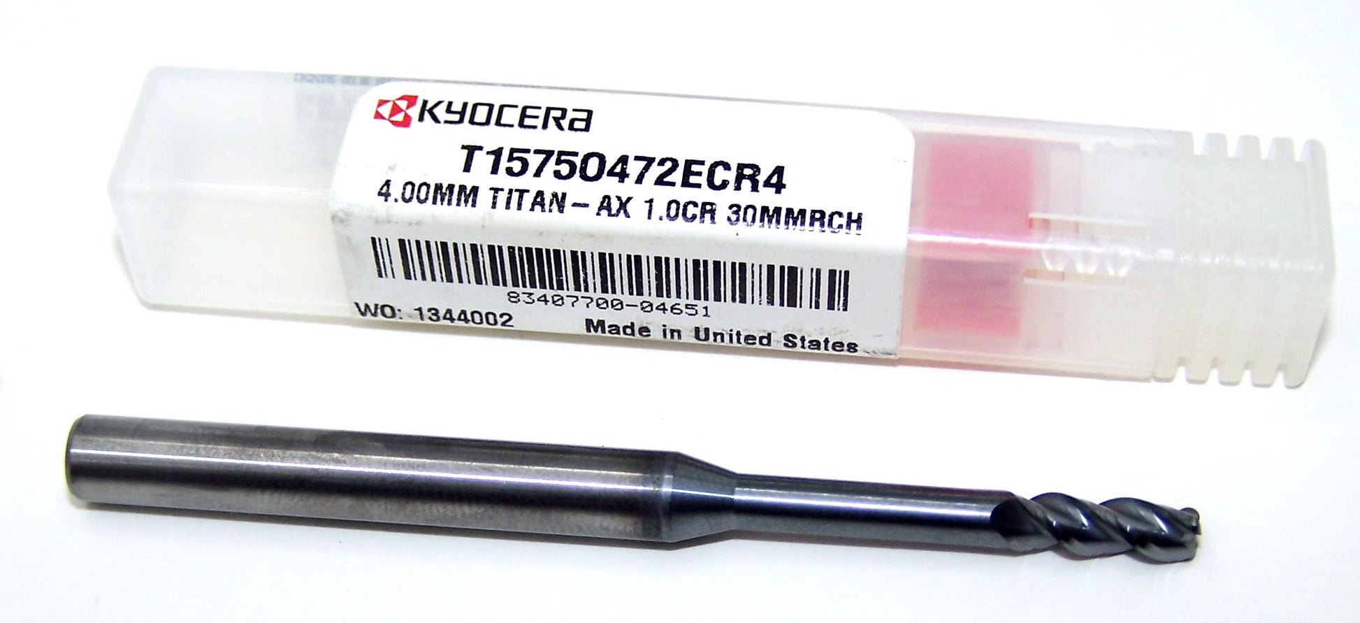 T1575O472ECR4 Kyocera Microtools 4.00mm Carbide 3 Flute End Mill Extended Reach .039" Radius Coated .1575" Diameter .236" Flute 2.50" Length .236"shank Titan Series