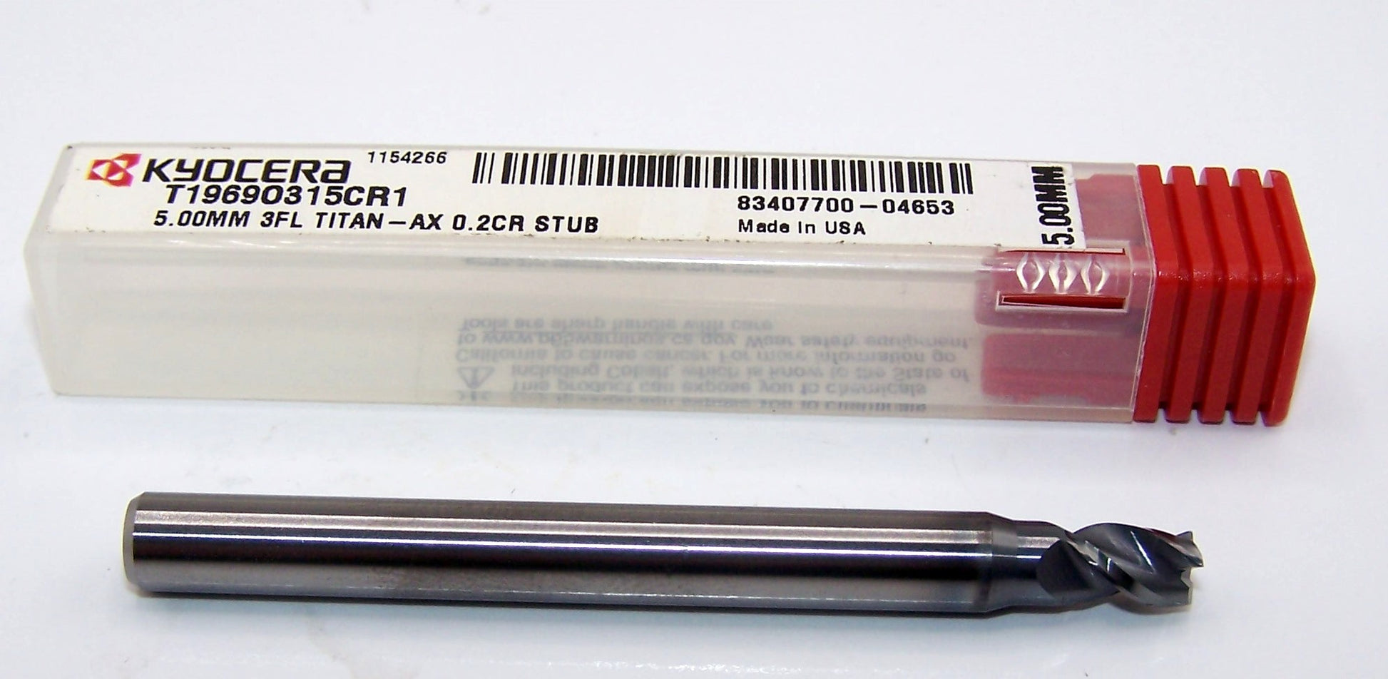 T1969O315CR1 Kyocera Microtools 5.00mm Carbide 3 Flute End Mill .008" Radius Coated .1969" Diameter .315" Flute 2.50" Length .236"shank Titan Series